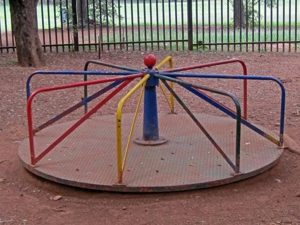Playground spinners, also known as roundabouts or carousels, are one of the classic playground fixtures that daredevils love to push to its limits. This spinning equipment allows kids to hop on and spin around as quickly as they can by kicking against the ground to develop momentum. They are also extremely dangerous and have been removed from all playgrounds, but when I was a kid, we played on all kinds of dangerous equipment. Remember the metal slides that would heat up to dangerous temperatures that we’d slide down in shorts?